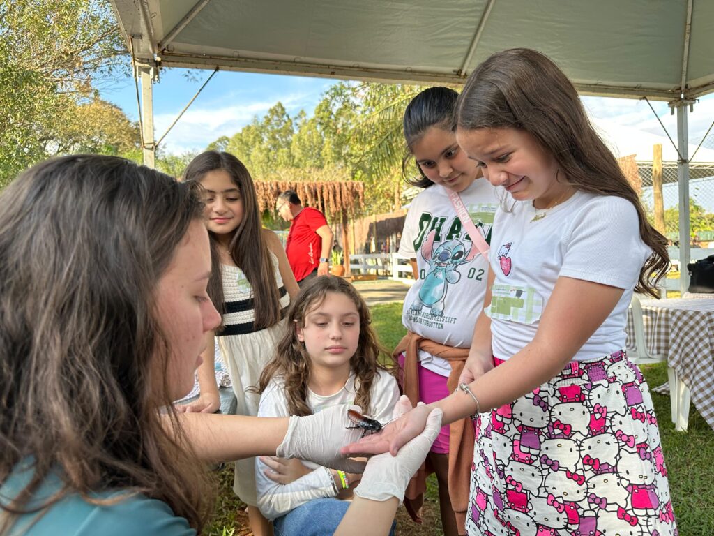 O primeiro final de semana da Colônia de Férias do Eco Park Foz, em Foz do Iguaçu, deixou as crianças encantadas com a oportunidade de virar mini cientistas, veterinários e biólogos e, assim, poder tocar e até alimentar os animais que vivem na Fazendinha. E as mães, mandaram mensagens agradecendo a iniciativa, o cuidado com os filhos e pelas lições ensinadas durante as atividades.