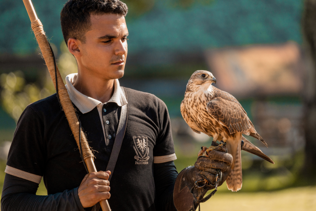Você acompanha um voo livre das aves de rapina, baseado na prática milenar da falcoaria, reconhecida pela UNESCO como patrimônio cultural da humanidade.